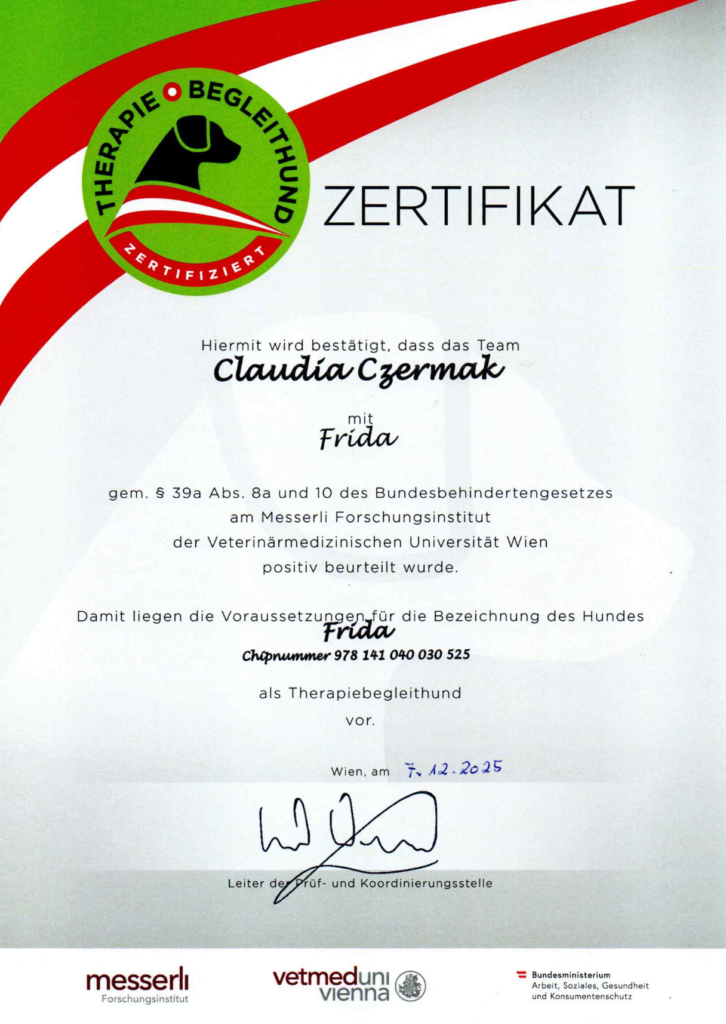 Sie wurde am 07.12.2025 vom Messerli Forschungsinstitut / Veterinärmedizinische Universität Wien offiziell als Therapiebegleithund geprüft und zertifiziert (§ 39a BBG).